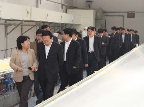 代表团随后来到二分厂8号车间,一边参观一边了解风力发电机生产工艺。代表团赞叹中复连众重视科技创新、重视人才培养的做法,也祝福中复连众早日实现亚洲最大的风力发电机叶片生产基地的目标。