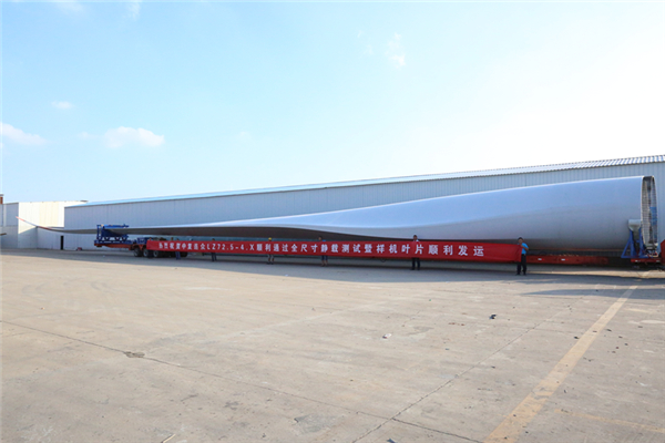 2018年7月20日,由中复连众研发生产的LZ72.5-4.X海陆通用型风机叶片顺利通过全尺寸静力测试,并完成首套样机叶片发运。该叶片的风轮直径148米,根部圆3200mm,叶片长度72.5米,容量4.XMW,重量20.5吨。